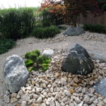 Umgestaltung eines Hausgartens mit Zierkiesbeeten, Rieselflächen im Wegebereich, Erstellung eines Holzdecks und Sichtschutzes sowie eines Quellsteins.