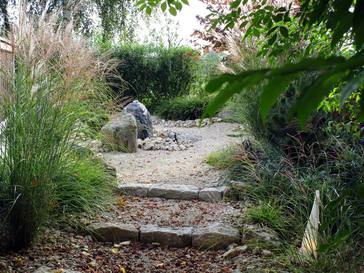 Wunsch der Auftraggeber war es, ein „japanisches Flair“ zu schaffen. In weiteren Bauabschnitten wurde ein Nutzgarten mit Hochbeeten aus Metall gestaltet sowie der Eingangsbereich mit hochwertigem Betonstein gepflastert. Die Ausführung erfolgte in 2013 und 2014.